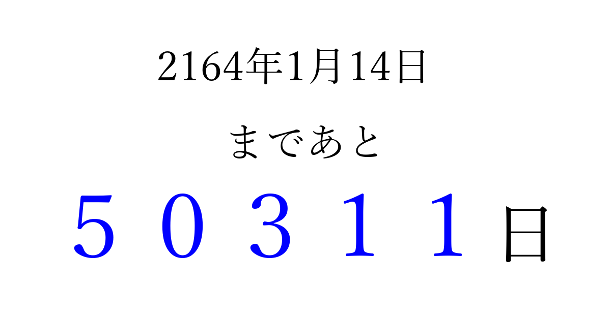 2164年1月14日(土)まで あと 99999 日です 追加すると、トップページからすぐ選べるようになります ※2026/04/16現在の結果です。 最新の状態に更新する ↓シェアして、タイムライン上にカウントダウンを表示しよう!↓ 📤 この結果を共有する Tweet シェア Threads Bluesky 別の日付でカウントダウン 2164年1月のカレンダー このページをブックマークに追加すると、いつでもカウントダウンを確認できます。 (PC: Ctrl+D / Mac: ⌘+D) hitome-notes.comでは以下のページも運営しています。 指定日と期間から日付を計算 | ガチャ確率計算・シミュレーション | プライバシー・ポリシー 運営者:Avocado