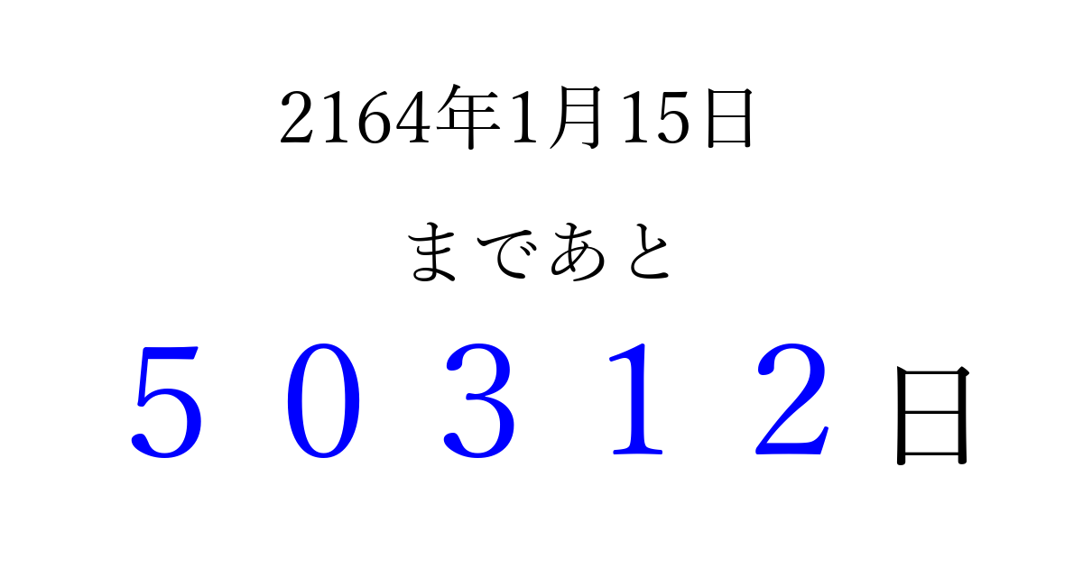 2164年1月15日(日)まで あと 99999 日です 追加すると、トップページからすぐ選べるようになります ※2026/04/16現在の結果です。 最新の状態に更新する ↓シェアして、タイムライン上にカウントダウンを表示しよう!↓ 📤 この結果を共有する Tweet シェア Threads Bluesky 別の日付でカウントダウン 2164年1月のカレンダー このページをブックマークに追加すると、いつでもカウントダウンを確認できます。 (PC: Ctrl+D / Mac: ⌘+D) hitome-notes.comでは以下のページも運営しています。 指定日と期間から日付を計算 | ガチャ確率計算・シミュレーション | プライバシー・ポリシー 運営者:Avocado
