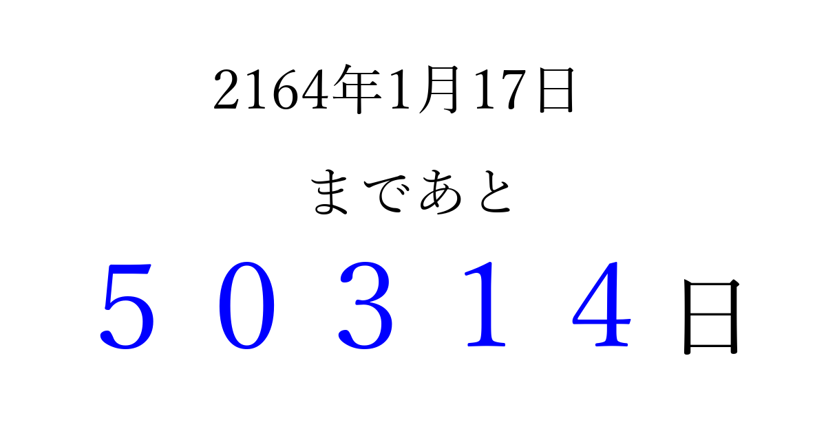 2164年1月17日(火)まで あと 99999 日です 追加すると、トップページからすぐ選べるようになります ※2026/04/16現在の結果です。 最新の状態に更新する ↓シェアして、タイムライン上にカウントダウンを表示しよう!↓ 📤 この結果を共有する Tweet シェア Threads Bluesky 別の日付でカウントダウン 2164年1月のカレンダー このページをブックマークに追加すると、いつでもカウントダウンを確認できます。 (PC: Ctrl+D / Mac: ⌘+D) hitome-notes.comでは以下のページも運営しています。 指定日と期間から日付を計算 | ガチャ確率計算・シミュレーション | プライバシー・ポリシー 運営者:Avocado