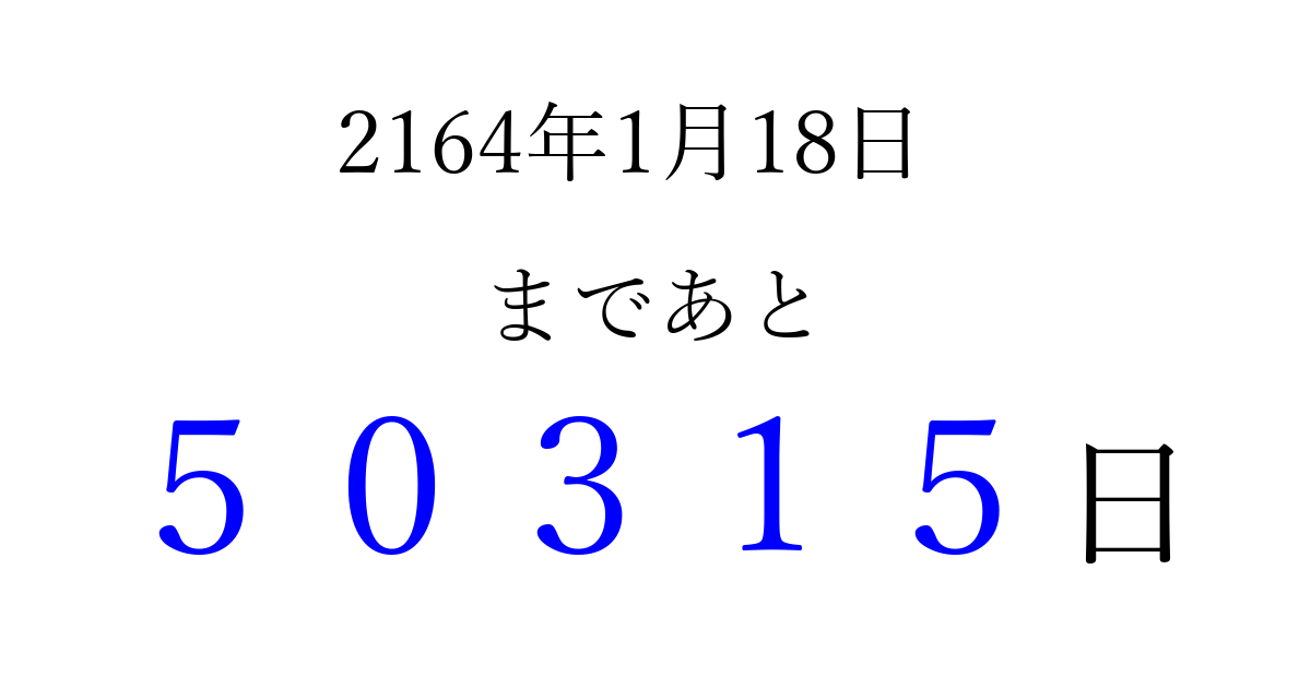 2164年1月18日(水)まで あと 99999 日です 追加すると、トップページからすぐ選べるようになります ※2026/04/16現在の結果です。 最新の状態に更新する ↓シェアして、タイムライン上にカウントダウンを表示しよう!↓ 📤 この結果を共有する Tweet シェア Threads Bluesky 別の日付でカウントダウン 2164年1月のカレンダー このページをブックマークに追加すると、いつでもカウントダウンを確認できます。 (PC: Ctrl+D / Mac: ⌘+D) hitome-notes.comでは以下のページも運営しています。 指定日と期間から日付を計算 | ガチャ確率計算・シミュレーション | プライバシー・ポリシー 運営者:Avocado