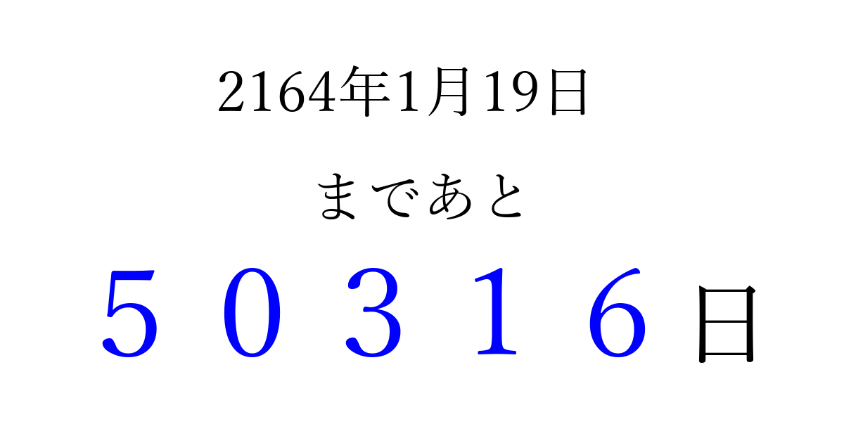 2164年1月19日(木)まで あと 99999 日です 追加すると、トップページからすぐ選べるようになります ※2026/04/16現在の結果です。 最新の状態に更新する ↓シェアして、タイムライン上にカウントダウンを表示しよう!↓ 📤 この結果を共有する Tweet シェア Threads Bluesky 別の日付でカウントダウン 2164年1月のカレンダー このページをブックマークに追加すると、いつでもカウントダウンを確認できます。 (PC: Ctrl+D / Mac: ⌘+D) hitome-notes.comでは以下のページも運営しています。 指定日と期間から日付を計算 | ガチャ確率計算・シミュレーション | プライバシー・ポリシー 運営者:Avocado
