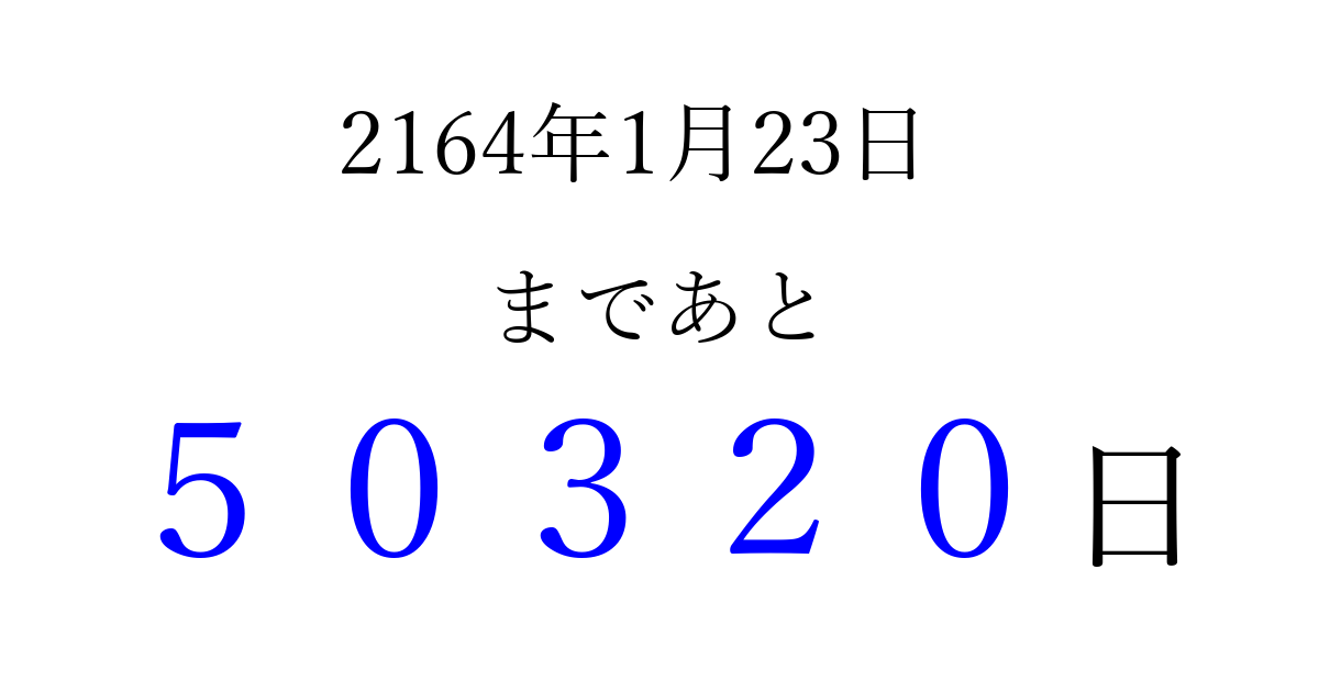 2164年1月23日(月)まで あと 99999 日です 追加すると、トップページからすぐ選べるようになります ※2026/04/16現在の結果です。 最新の状態に更新する ↓シェアして、タイムライン上にカウントダウンを表示しよう!↓ 📤 この結果を共有する Tweet シェア Threads Bluesky 別の日付でカウントダウン 2164年1月のカレンダー このページをブックマークに追加すると、いつでもカウントダウンを確認できます。 (PC: Ctrl+D / Mac: ⌘+D) hitome-notes.comでは以下のページも運営しています。 指定日と期間から日付を計算 | ガチャ確率計算・シミュレーション | プライバシー・ポリシー 運営者:Avocado
