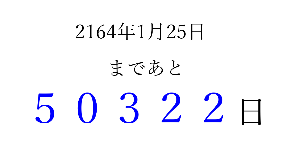 2164年1月25日(水)まで あと 99999 日です 追加すると、トップページからすぐ選べるようになります ※2026/04/16現在の結果です。 最新の状態に更新する ↓シェアして、タイムライン上にカウントダウンを表示しよう!↓ 📤 この結果を共有する Tweet シェア Threads Bluesky 別の日付でカウントダウン 2164年1月のカレンダー このページをブックマークに追加すると、いつでもカウントダウンを確認できます。 (PC: Ctrl+D / Mac: ⌘+D) hitome-notes.comでは以下のページも運営しています。 指定日と期間から日付を計算 | ガチャ確率計算・シミュレーション | プライバシー・ポリシー 運営者:Avocado