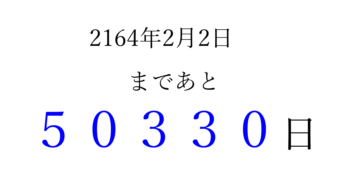 2164年2月2日(木)まで あと 99999 日です 追加すると、トップページからすぐ選べるようになります ※2026/04/16現在の結果です。 最新の状態に更新する ↓シェアして、タイムライン上にカウントダウンを表示しよう!↓ 📤 この結果を共有する Tweet シェア Threads Bluesky 別の日付でカウントダウン 2164年2月のカレンダー このページをブックマークに追加すると、いつでもカウントダウンを確認できます。 (PC: Ctrl+D / Mac: ⌘+D) hitome-notes.comでは以下のページも運営しています。 指定日と期間から日付を計算 | ガチャ確率計算・シミュレーション | プライバシー・ポリシー 運営者:Avocado