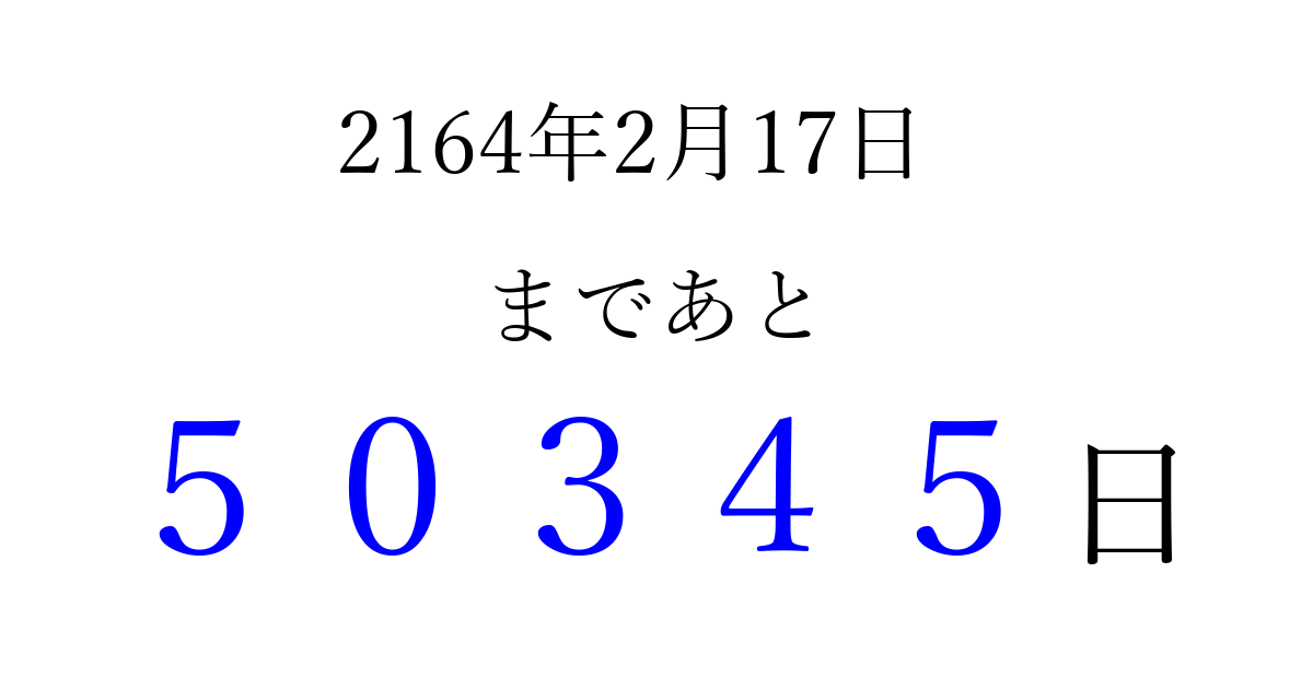 2164年2月17日(金)まで あと 99999 日です 追加すると、トップページからすぐ選べるようになります ※2026/04/16現在の結果です。 最新の状態に更新する ↓シェアして、タイムライン上にカウントダウンを表示しよう!↓ 📤 この結果を共有する Tweet シェア Threads Bluesky 別の日付でカウントダウン 2164年2月のカレンダー このページをブックマークに追加すると、いつでもカウントダウンを確認できます。 (PC: Ctrl+D / Mac: ⌘+D) hitome-notes.comでは以下のページも運営しています。 指定日と期間から日付を計算 | ガチャ確率計算・シミュレーション | プライバシー・ポリシー 運営者:Avocado
