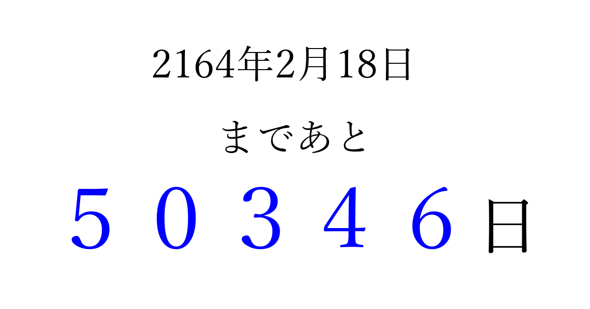 2164年2月18日(土)まで あと 99999 日です 追加すると、トップページからすぐ選べるようになります ※2026/04/16現在の結果です。 最新の状態に更新する ↓シェアして、タイムライン上にカウントダウンを表示しよう!↓ 📤 この結果を共有する Tweet シェア Threads Bluesky 別の日付でカウントダウン 2164年2月のカレンダー このページをブックマークに追加すると、いつでもカウントダウンを確認できます。 (PC: Ctrl+D / Mac: ⌘+D) hitome-notes.comでは以下のページも運営しています。 指定日と期間から日付を計算 | ガチャ確率計算・シミュレーション | プライバシー・ポリシー 運営者:Avocado