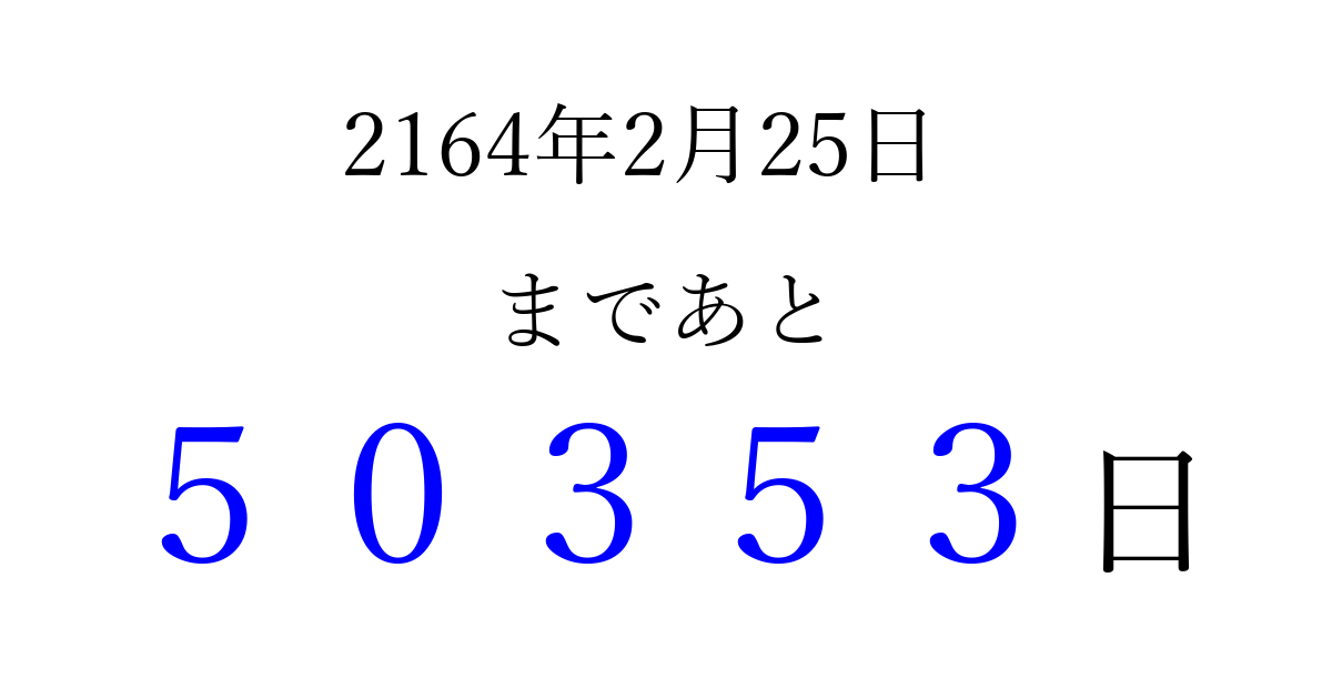 2164年2月25日(土)まで あと 99999 日です 追加すると、トップページからすぐ選べるようになります ※2026/04/16現在の結果です。 最新の状態に更新する ↓シェアして、タイムライン上にカウントダウンを表示しよう!↓ 📤 この結果を共有する Tweet シェア Threads Bluesky 別の日付でカウントダウン 2164年2月のカレンダー このページをブックマークに追加すると、いつでもカウントダウンを確認できます。 (PC: Ctrl+D / Mac: ⌘+D) hitome-notes.comでは以下のページも運営しています。 指定日と期間から日付を計算 | ガチャ確率計算・シミュレーション | プライバシー・ポリシー 運営者:Avocado