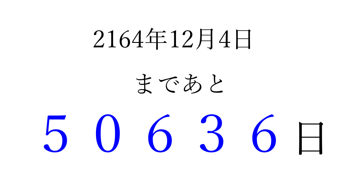 2164年12月4日(火)まで あと 99999 日です 追加すると、トップページからすぐ選べるようになります ※2026/04/16現在の結果です。 最新の状態に更新する ↓シェアして、タイムライン上にカウントダウンを表示しよう!↓ 📤 この結果を共有する Tweet シェア Threads Bluesky 別の日付でカウントダウン 2164年12月のカレンダー このページをブックマークに追加すると、いつでもカウントダウンを確認できます。 (PC: Ctrl+D / Mac: ⌘+D) hitome-notes.comでは以下のページも運営しています。 指定日と期間から日付を計算 | ガチャ確率計算・シミュレーション | プライバシー・ポリシー 運営者:Avocado